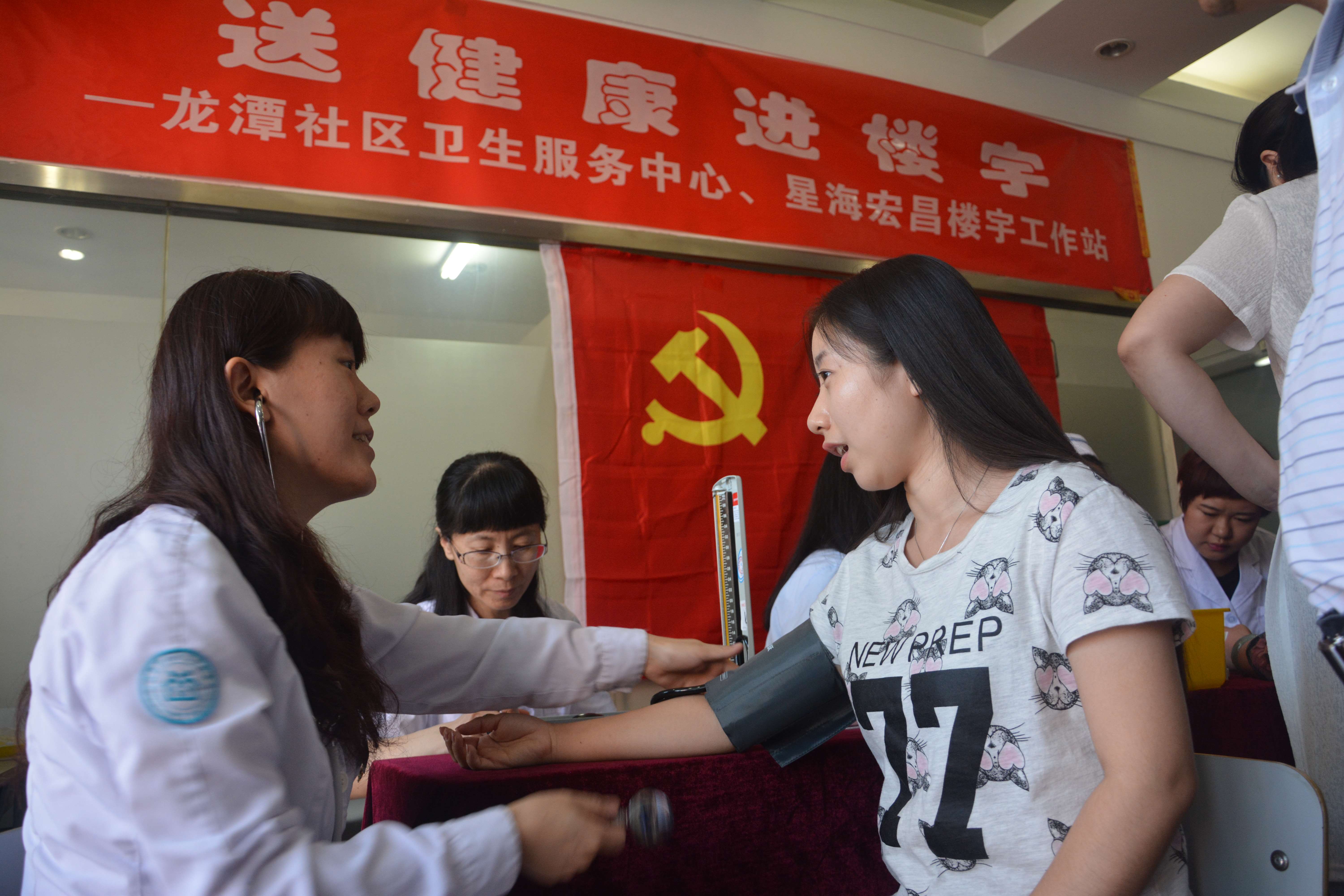 6月24日上午,星海宏昌大厦商务楼宇工作站邀请龙潭社区卫生服务中心医师来到星海宏昌大厦为楼宇内60余家非公企业职工免费量血压、测血糖,发放健康知识材料。
