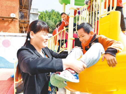 支月英在学校院子里陪学生做游戏。